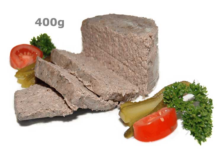 53% Schweinefleisch, 21% Schweineleber, Speck, Wasser (Brühe), Zwiebel, Kräuter, Gewürze, Speisesalz. Geschmacksverstärker: Mononatriumglutamat.